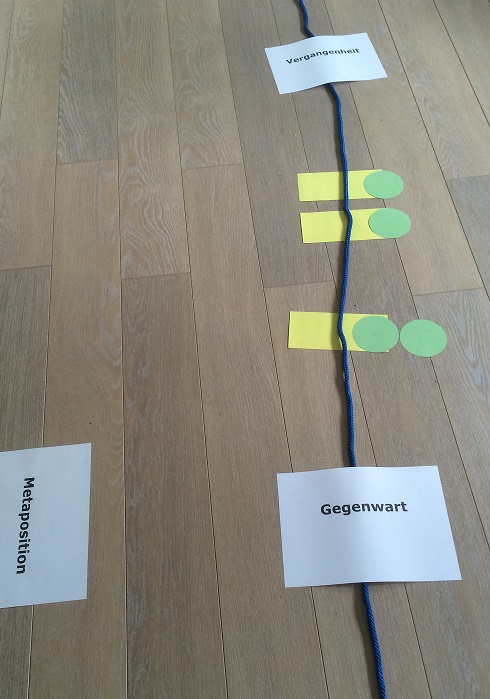 Durch den Schritt aus der Timeline ist sie dissoziiert vom Gefühl und kann durch den Abstand unbelastet Ideen entwickeln. Ich regte sie an in ihrer Vergangenheit nach Erlebnissen zu suchen in denen sie genau dieses Gefühl hatte und es schaffte sich davon zu befreien. Also ging sie in die Position Gegenwart zurück und schritt langsam über ihre Timeline in Richtung Vergangenheit. Insgesamt kam sie auf 3 Situationen, die zur Thematik passten. Dort verweilte sie um genau herauszufinden, was oder wer ihr aus der ungewünschten Gefühlslage geholfen hatte. Im Verlauf der Übung ging sie immer wieder auf die Metaposition um auch den Blick von außen auf das Erlebnis zu haben und sich zu dissoziieren.